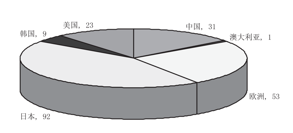 1996 年 1 月 1 日至 2016 年 12 月 1 日,涉及低表面能有機(jī)硅船舶防污涂料技術(shù)的國(guó)內(nèi)外專(zhuān)利共有 209 件,圖 1 是各國(guó)申請(qǐng)人申請(qǐng)量分布圖,從圖中可以看出, 日本的申請(qǐng)數(shù)量為 92 件,居于首位,其次是歐洲 53 件, 中國(guó) 31 件,美國(guó) 23 件。
