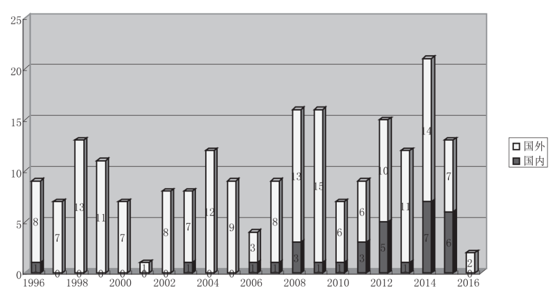 2.1 1996—2016 年國(guó)內(nèi)外申請(qǐng)量分布