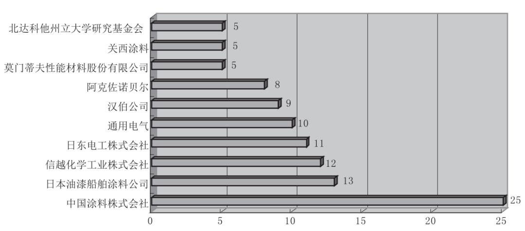 國(guó)內(nèi)申請(qǐng)中各個(gè)申請(qǐng)人的申請(qǐng)量均不高,且集 中在中國(guó)船舶重工集團(tuán)公司第七二五研究所、大連 海事大學(xué)等研究機(jī)構(gòu)、高校中,企業(yè)申請(qǐng)較少,可市場(chǎng)化應(yīng)用的產(chǎn)品也較少,而國(guó)外企業(yè)已有大量成熟的產(chǎn)品占領(lǐng)市場(chǎng),例如中國(guó)涂料株式會(huì)社的 Seajet 2000、 漢 伯 公 司 的 Hempasil SP-EED 77100 等、關(guān)西涂料的 Captain Biox 系列產(chǎn)品,擁有自主知識(shí)產(chǎn)權(quán)的低表面能有機(jī)硅船舶防污涂料產(chǎn)品對(duì)國(guó)內(nèi)企業(yè)來(lái)說(shuō)已迫在眉睫。