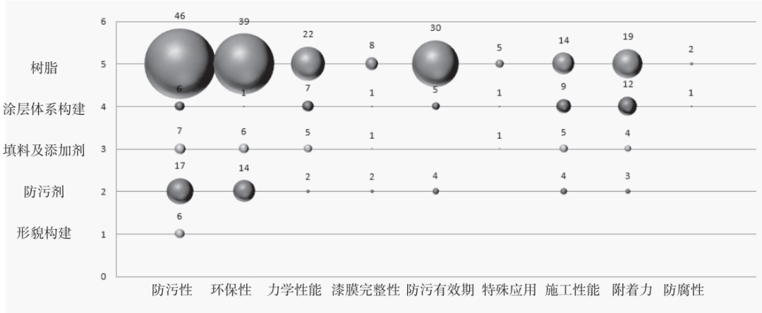 對(duì) 209 件專(zhuān)利申請(qǐng)進(jìn)行分析和梳理后,對(duì)其中主 要的技術(shù)功效進(jìn)行分析,圖 5 是低表面能有機(jī)硅船舶防污涂料技術(shù)功效分布圖。